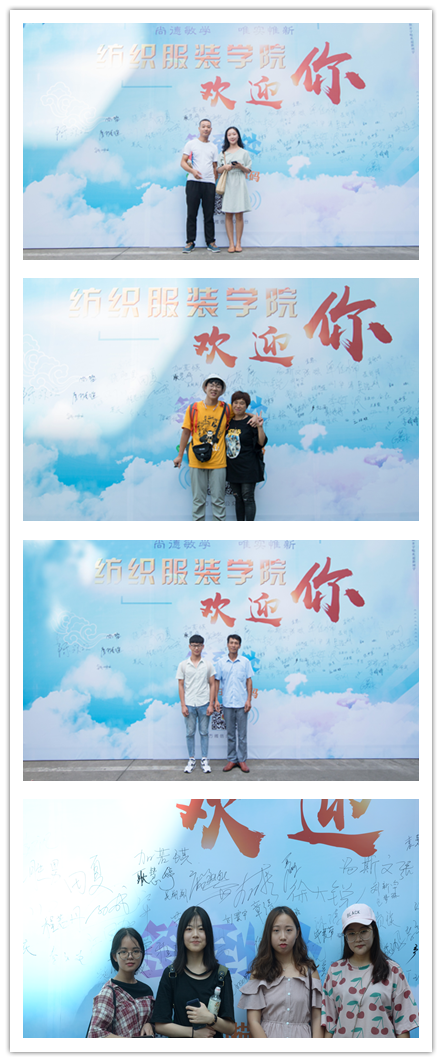 在迎新报到现场,学院还策划了一个十分有意义的签到留念活动,让新生在写有“纺织服装学院欢迎你”等字样的签到墙上留下自己的姓名和身影,用相机记录下他们初入大学时的青葱模样。