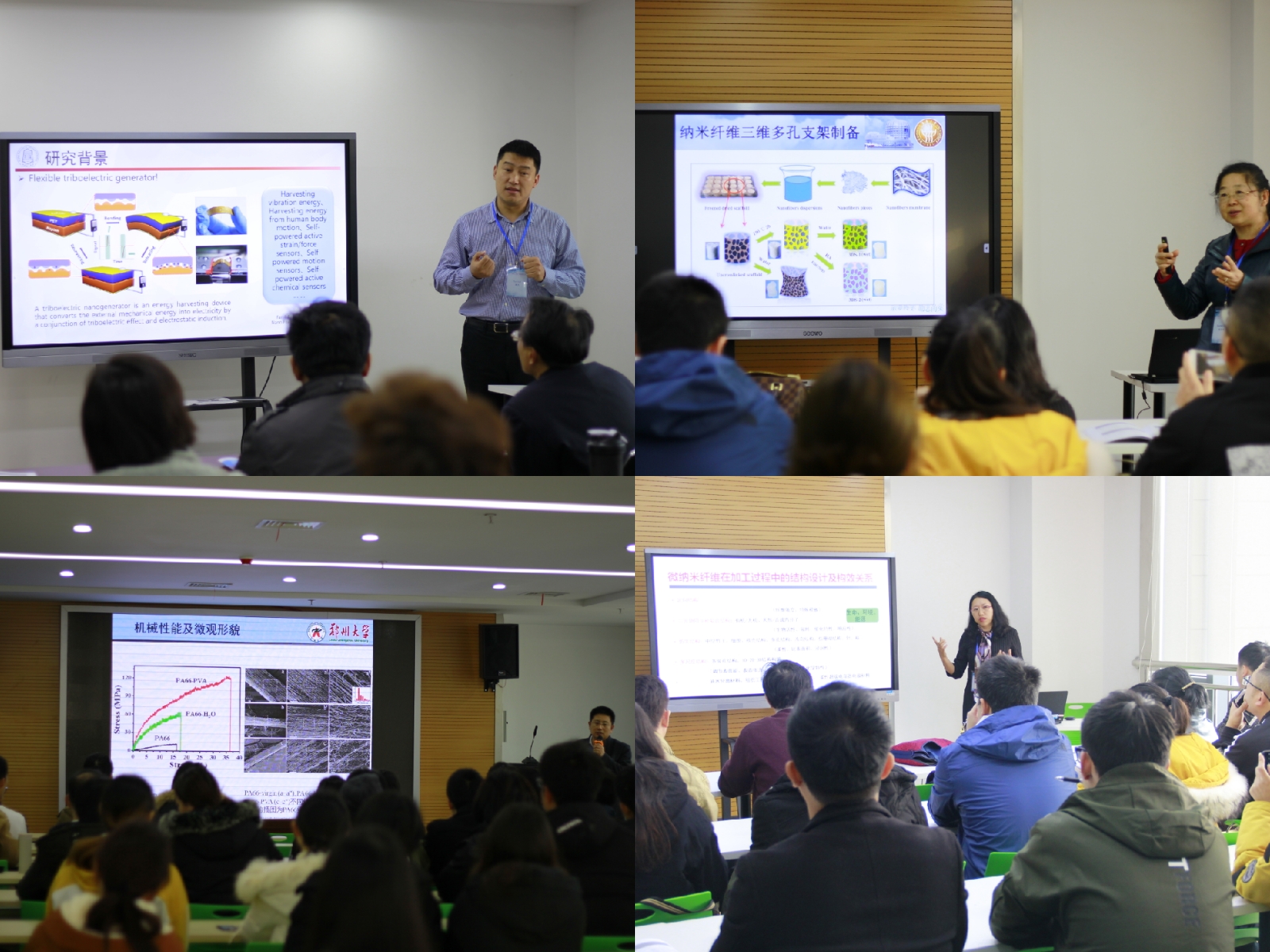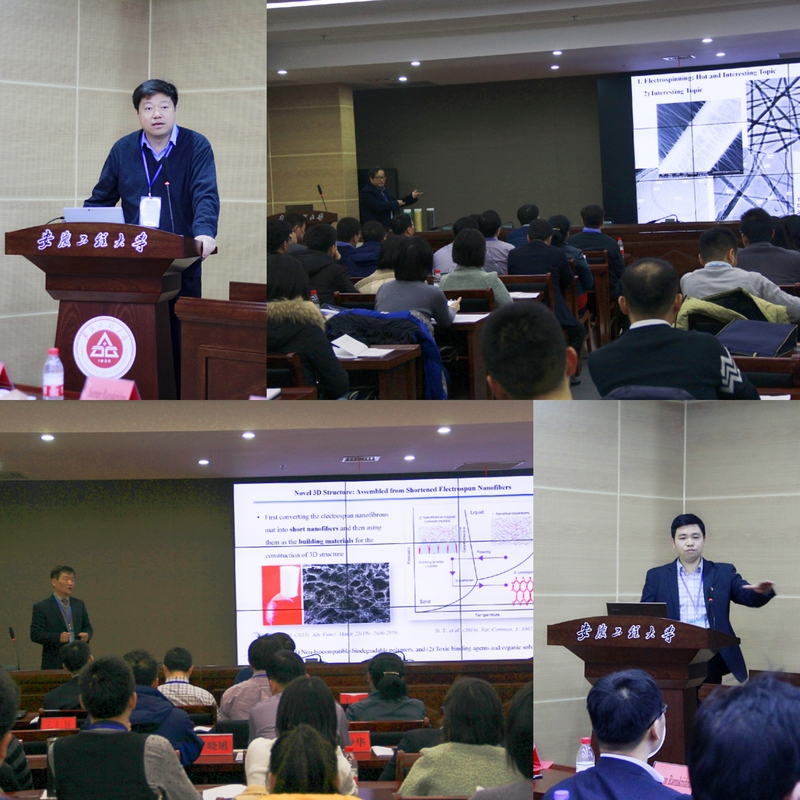 下午,会议邀请东华大学丁彬教授、江西师范大学侯豪情教授、北京航天航空大学赵勇教授、山东大学陈代荣教授、青岛大学龙云泽教授、武汉纺织大学刘延波教授以及冯浩教授和魏取福教授分别做了8场精彩的报告。报告主要围绕静电纺丝技术及功能纳米纤维,特别是在生物医学、光电能源、柔性器件、分离等领域的应用开展了深入讨论。