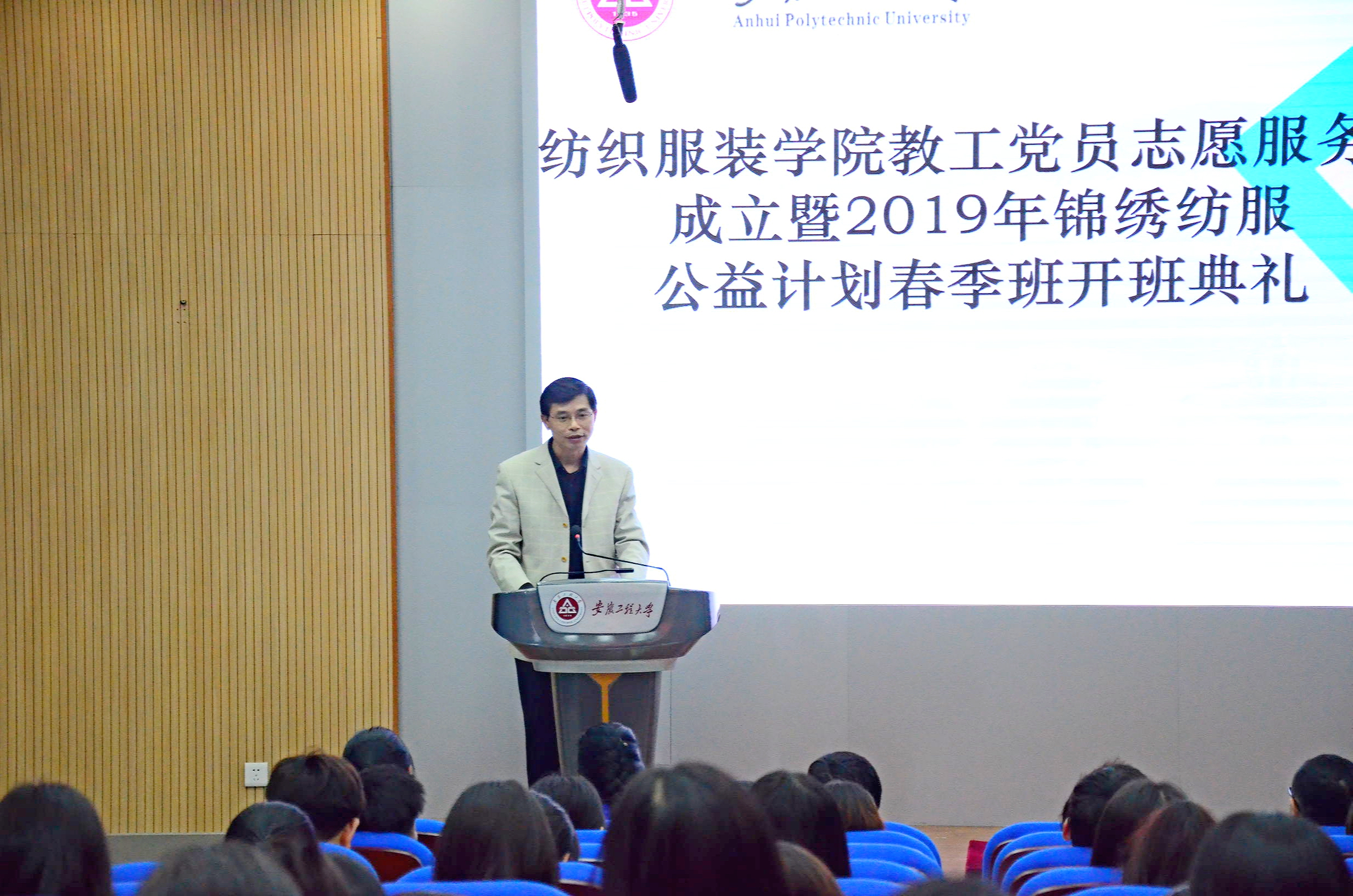 学生处处长刘金斌在讲话中指出,纺织服装学院成立教工党员志愿服务队并启动“锦绣纺服”公益计划,是推动党建品牌创建,创新学生培养载体的重要尝试,也是坚持以美育人、以文化人,强化学生审美和人文素养的积极探索。