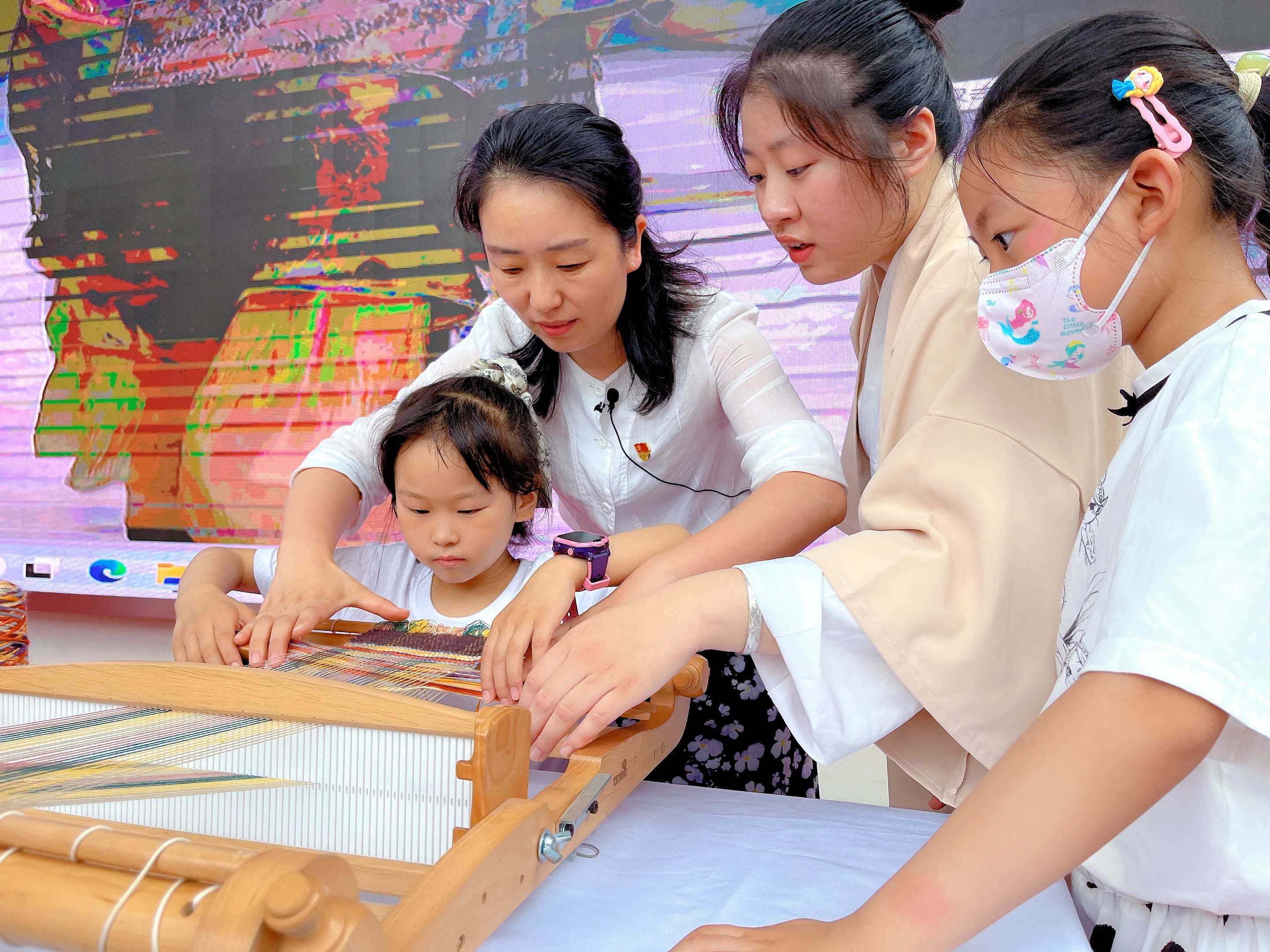 随后,李敏指导孩子们现场动手编制简易花篮,体会经纬交织的奥秘,体验实践创新之乐,进一步培养青少年脚踏实地、精益求精、勇于创新的精神。期间,学生志愿者身着宇航服来到现场,给孩子们讲解神州十六号纺织品,与孩子们一起热议神舟十六号成功发射,专业知识与时政融合,进一步强化孩子们对“大纺织”的认识,激发孩子们崇尚科学、科技报国的家国情怀。
