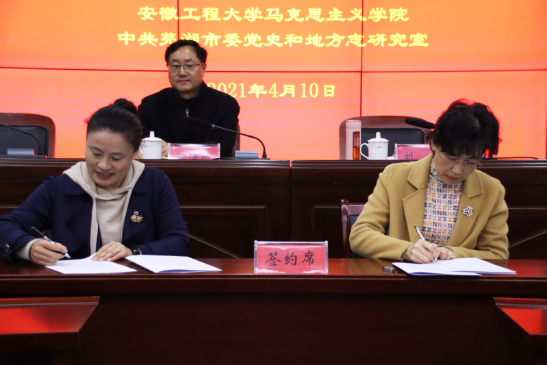 在全场的热烈掌声中,孙浩然和刘萍共同为“皖江红色文化研究中心”揭牌。吴月红与刘萍分别代表双方单位签订了《皖江红色文化研究中心合作共建协议书》及《党支部共建协议》。刘萍代表市委党史和地方志研究室向皖江红色文化研究中心赠书。