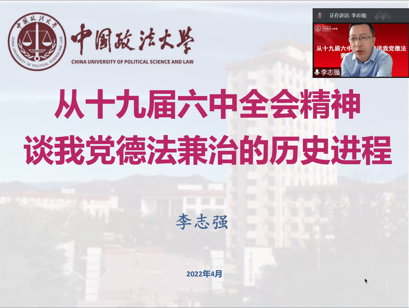 4月19日下午,中央马克思主义理论研究和建设工程专家、中国政法大学马克思主义学院李志强教授受邀为马克思主义学院全体专兼职思政课教师和研究生,作题为“从十九届六中全会精神谈我党德法兼治的历史进程”的专题报告。讲座采用腾讯会议形式。马克思主义学院副院长李海涛主持报告会。
