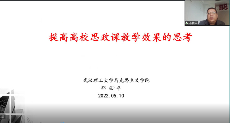 5月10日下午,武汉理工大学马克思主义学院邵献平教授受邀为马克思主义学院全体专兼职思政课教师和研究生,作题为“关于提升高校思政课课堂教学效果的思考”的专题报告。本场报告会是今年马克思主义学院学术活动月的第四场报告,报告采用腾讯会议形式。马克思主义学院李海涛院长主持报告会。