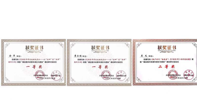 近日,由共青团安徽省委员会、安徽师范大学共同主办,安徽省青少年研究会、“青马工程”全国研究培训基地(安徽师范大学)、安徽师范大学马克思主义学院承办的“新征程中的青年与使命理论研讨会”在芜湖举行。会议面向全国公开征文共311篇,经共青团与青年工作研究领域的专家学者匿名评审,共有60篇论文获奖,其中一等奖10篇,二等奖20篇,三等奖30篇。我院研究生取得优异成绩,余洋、廖玉林的论文《芜湖青年学生运动及启示——以“五四”至“五卅”期间为例》荣获一等奖;吴凡的论文《助产时代“奋进者”:<中国青年>的价值底蕴》获得二等奖。