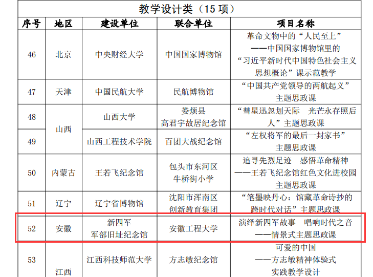 该项目旨在贯彻落实习近平总书记关于革命文物工作和“大思政课”建设重要指示批示精神,推动革命文物资源与大中小学思政教育一体化建设融合发展,分为现场教学、教学设计、校园文化、数字传播、读本读物及其他六个子类。安徽省共有两个项目入选,我校为唯一入选高校。