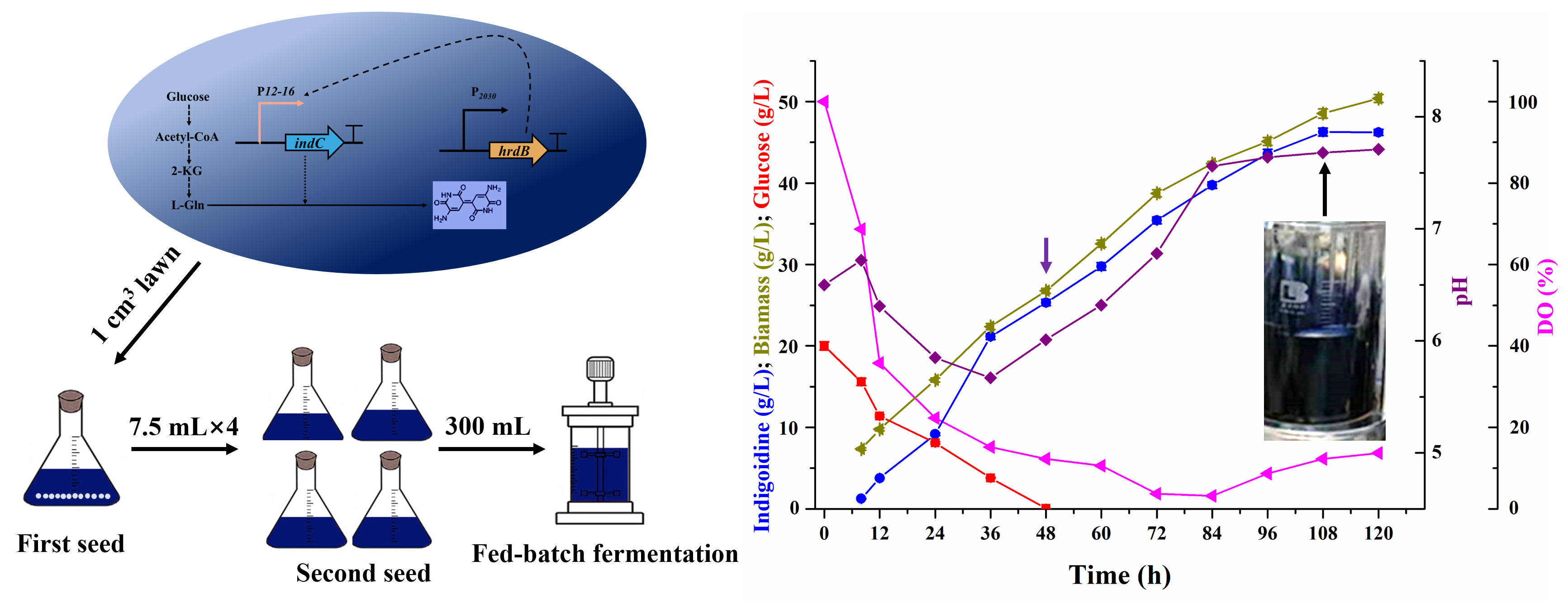 靛蓝是目前人类所知最古老的色素之一,也是应用于纺织印染行业最古老的染料之一。在历史的长河中,靛蓝的生产方式从古代的植物浸泡到近现代的化学合成,并逐步进入生物合成时期。靛蓝主要由L-谷氨酰胺经靛蓝合成酶缩合反应合成,靛蓝合成酶 IndC 大部分来源于链霉菌属。然而,链霉菌代谢开关在不同代谢阶段存在时空差异,因此全面优化其生产力是一个挑战,这使得链霉菌难以生产低附加值的大宗化学品。因此,大部分研究人员选择在异源宿主如大肠杆菌、谷氨酸棒杆菌等中过表达 IndC,以实现靛蓝的高水平生产。
