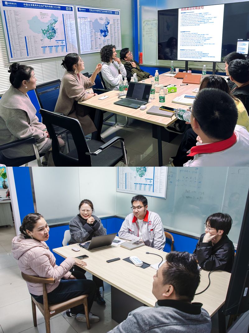 活动现场,由外国语学院MTI研究生、国际教育学院机械工程专业部分留学生和瑞泰骨干员工组成的 “跨文化交流小组成为亮点。在分组交流环节,各个小组围绕商务英语的实际应用和跨文化交际等主题开展情景模拟,企业员工在实战演练中提升语言应用能力,留学生则从语言表达和跨文化交流等方面进行了现场指导。在交流环节,韩利敏和涂文婷老师走动于各个小组之间,动态引导活动进程,帮助参与交流的企业员工和留学生更好地融入情景。